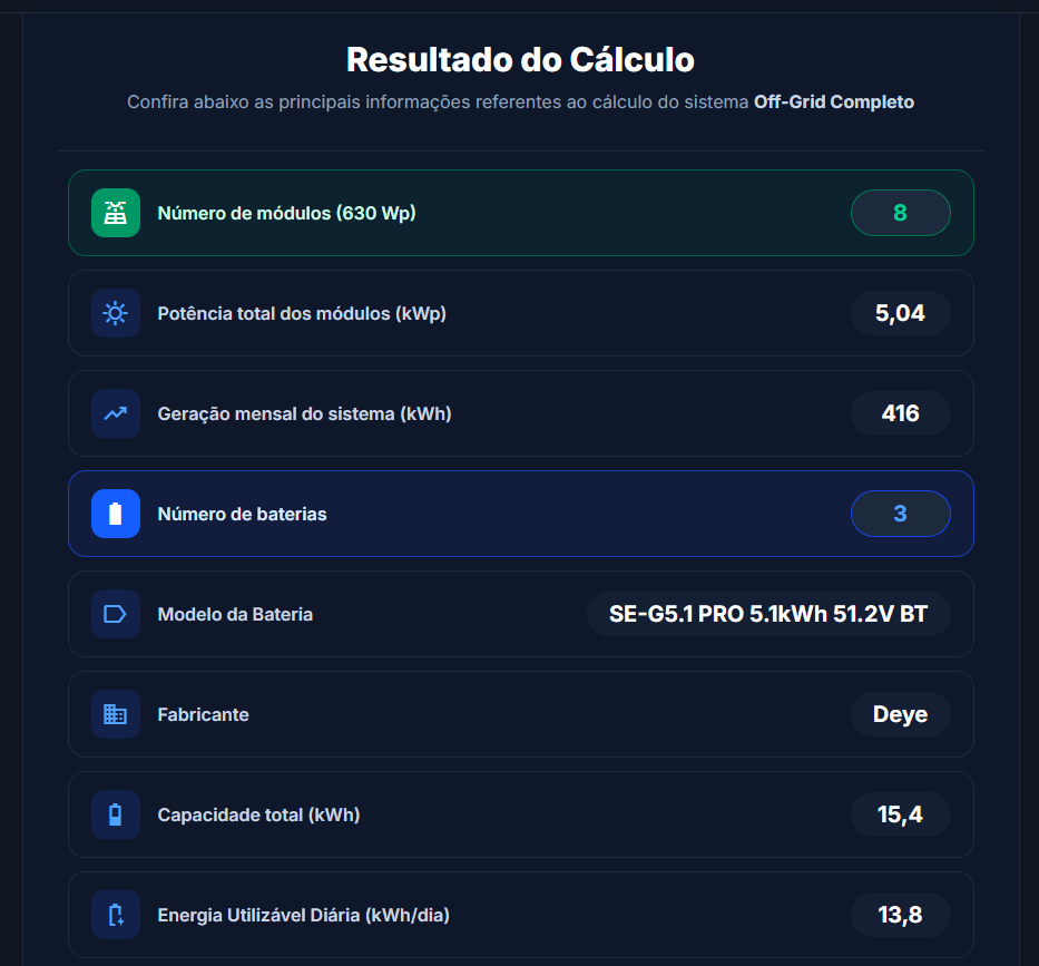 Entregamos um resultado com as informações essenciais sobre painel, baterias e inversor.